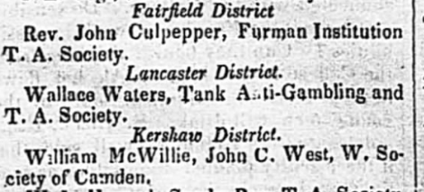 Currently, the only record located which names Wallace in South Carolina comes from a newspaper The Edgefield Advertiser. On August 7th, 1844 the paper published the proceedings of a state temperance convention which was held at the courthouse of Edgefield on 31st of July and 1st of August. Within these preceedings we find Wallace listed as the delegate from Lancaster district, he is part of the Anti-Gambling and T. A. Society. T. A. stands for ‘Total Abstinence’. Wallace appears to have been a supporter of the early temperance movement in the United States as well as an opponent of gambling.