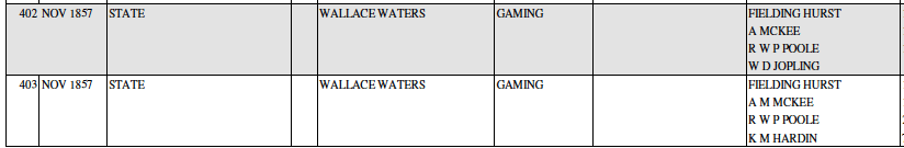 Records for Wallace Waters do surface in McNairy County, Tennessee between 1855 and 1860. They are found in Circuit Court Execution Dockets which have been compiled by Helen King, Dorothy Smith and Nancy Kennedy. In these records Wallace Waters’ name appears upwards of seventeen times during the five year span as a defendant to the charges of ‘Gaming’. Fielding Hurst is regularly named witness for some of these charges against Wallace. Hurst also has similar charges of ‘Gaming’ brought against him. Wallace’s shift from leadership of an anti-gambling society in South Carolina to defendant on multiple charges of gaming in Tennessee in only ten years time is a turnabout worth pondering. A few examples of the charges appear below.