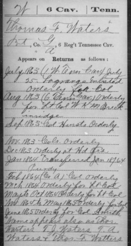 Thomas Waters’ assignments during his service suggests someone who was granted a certain amount of privilege. This may have been due to his father’s influence or Thomas’ own character, perhaps some of both. He served as a colonel’s orderly throughout his service. The colonels he served in this capacity included Lt. Col. William K. M. Breckinridge who was Hurst’s second in command, Col. Hurst himself and Col. Smith who replaced Hurst as leader of the 6th Tennessee Cavalry at the end of the war. Kautz’s Customs of Service for NCOs and Soldiers describes the position thusly –