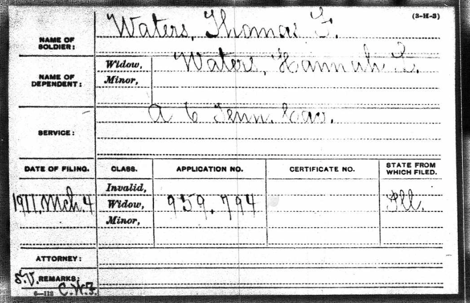 Thomas Waters outlived his first wife Mary and shortly before his death in November of 1910 he married a young widow named Hannah North Lilley. She made application for a pension based on Thomas’ service in the 6th Tennessee Cavalry. Interestingly she had also applied for prior pension under her first husband, a Mr. Lilley.